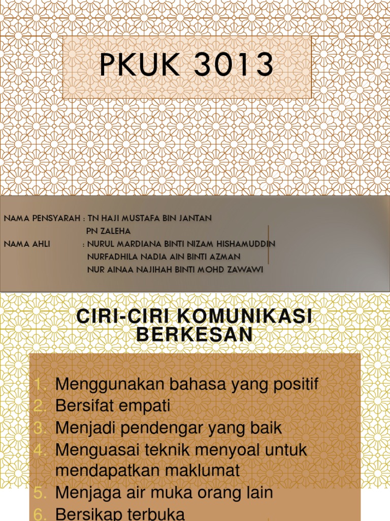 1o pengenalan 20 ciri-ciri komunikator yang baik efektif dan efisien 30 ciri-ciri untuk menjadi pendengar yang berkesan 40 komunikasi dari sudut islam 50 proses komunikasi 60 langkah.